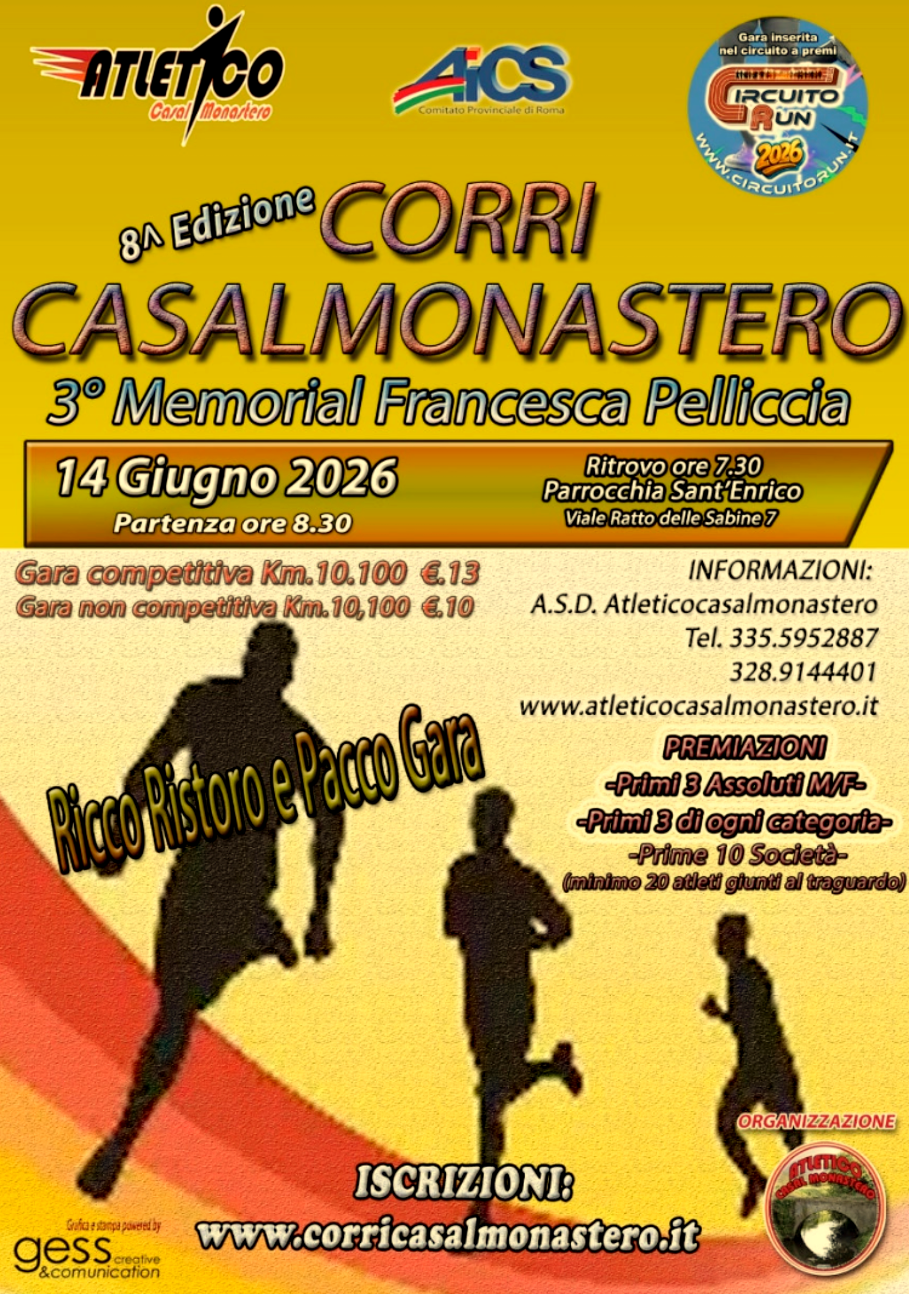 ASD ATLETICO CASAL MONASTERO organizza la 8ª edizione della CORRI CASAL MONASTERO 2026, gara podistica competitiva di circa 10 Km (con anche prova non competitiva sullo stesso percorso), inserita nel circuito “Circuito Run 2026”
