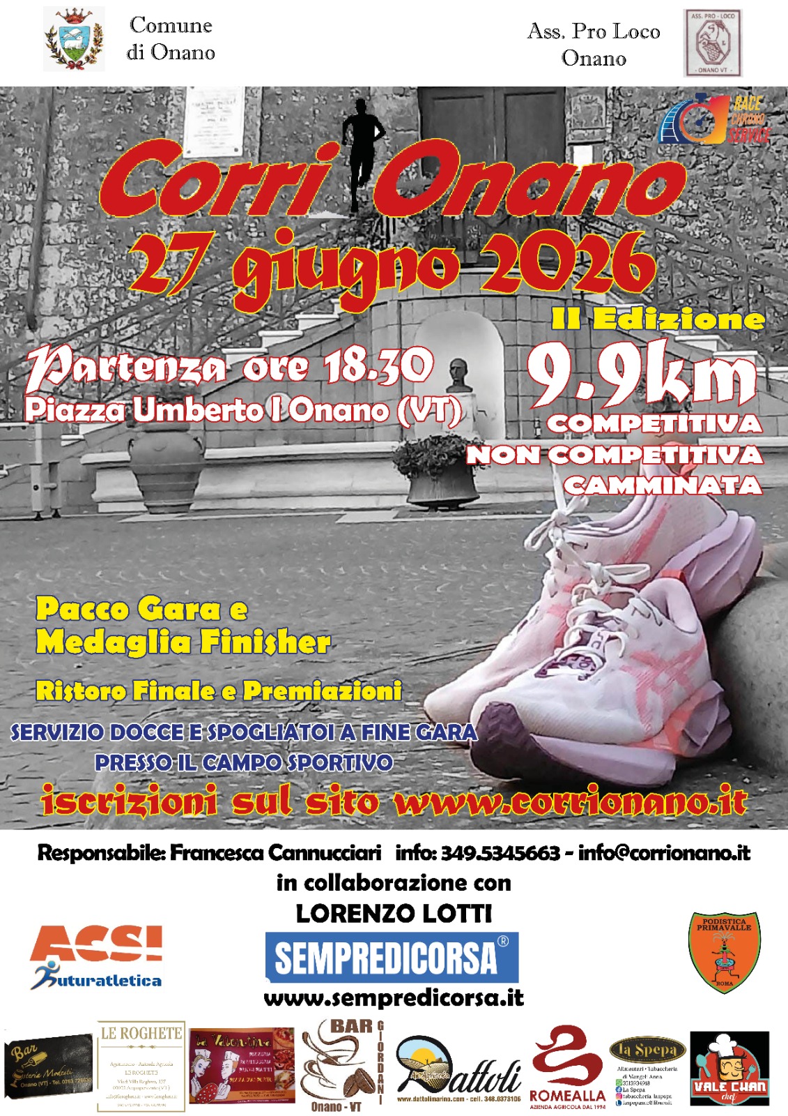Il Comune di Onano, l’Associazione Pro Loco di Onano e la Responsabile Organizzativa Francesca Cannucciari, con la collaborazione di ACSI Futuratletica e della A.S.D. Podistica Primavalle Roma, organizzano la 2ª edizione della CORRI ONANO, manifestazione di corsa su strada competitiva e non competitiva, oltre a camminata, sulla distanza di circa 9,9 km.